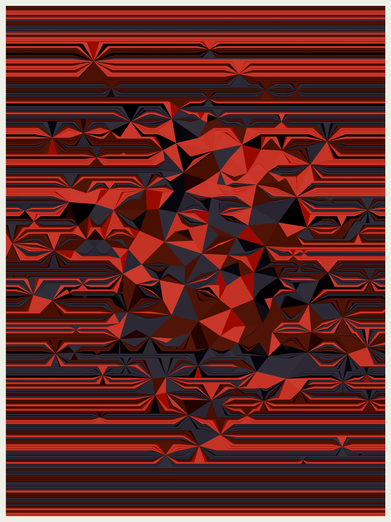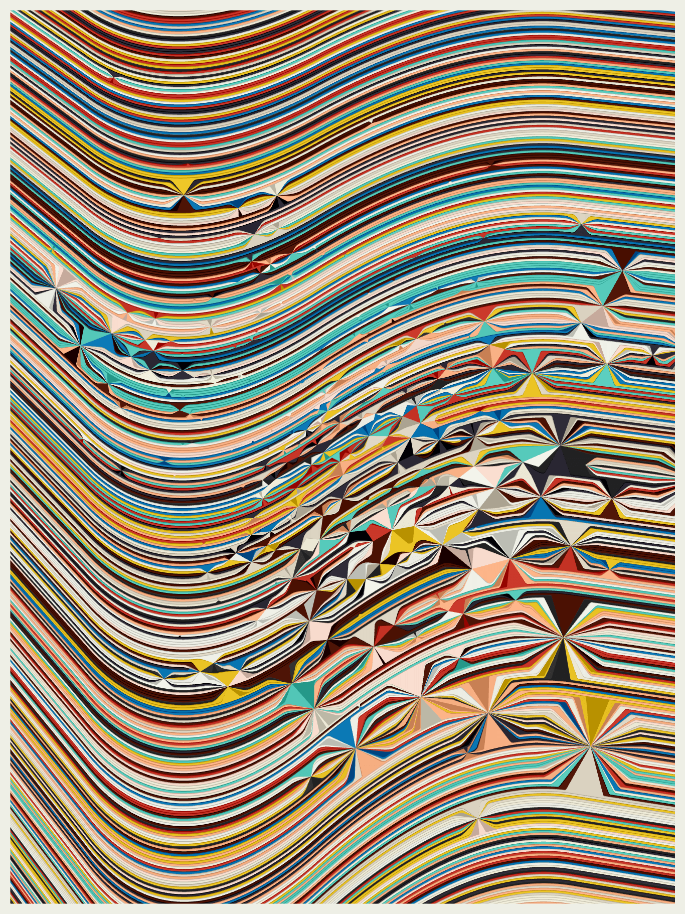 The series draws inspiration from various sources, including the natural undulations of sediment in the Earth's crust and the human act of origami. Fold explores the structural and organizational power of folds while also demonstrating how they can dramatically distort and redefine shapes on the canvas. The work is heavily influenced by op art greats like Bridget Riley and Victor Vasarely, focusing on the perceptual aspects of art resulting from the illusion of movement and color relationships.